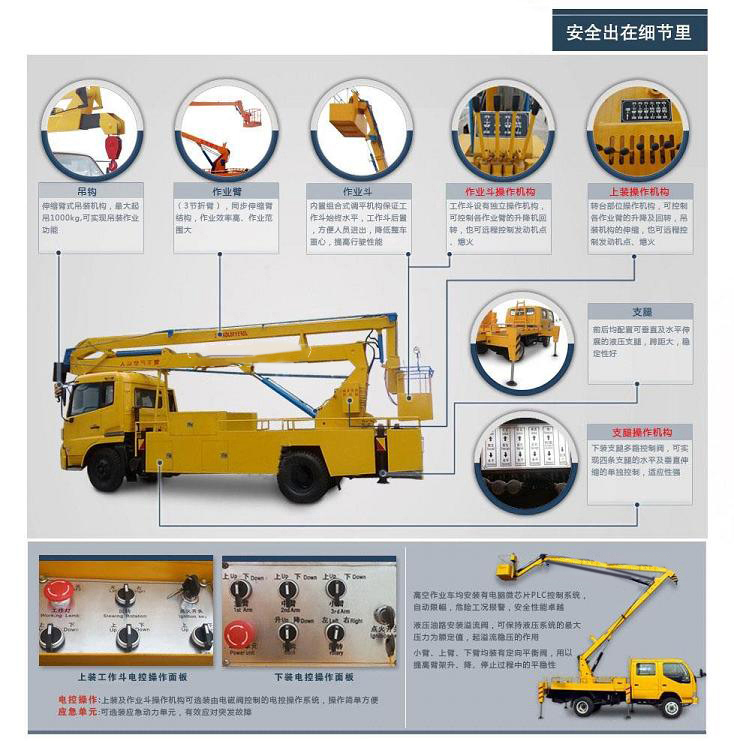 標(biāo)準(zhǔn): 高空作業(yè)車:產(chǎn)品結(jié)構(gòu)簡單、堅固耐用、操作方便可靠。獨特設(shè)計的全回轉(zhuǎn)三折臂液壓操控系統(tǒng)使工作人員在高空作業(yè)時操作更平穩(wěn),能安全有效的將工作人員送到8-24進(jìn)行高空作業(yè)或者進(jìn)行維修、安裝、清洗、攝影、造船、化工、電力、剪枝、更換路燈及其他工程搶修作業(yè)。該車電動操作系統(tǒng)均采用防水開關(guān),避免了開關(guān)易進(jìn)水,銹蝕漏電的問題,工作斗采用管狀工作斗,造型美觀,在工作斗和轉(zhuǎn)臺實行雙位置操作,使用方便,維修簡便,安全可靠。
